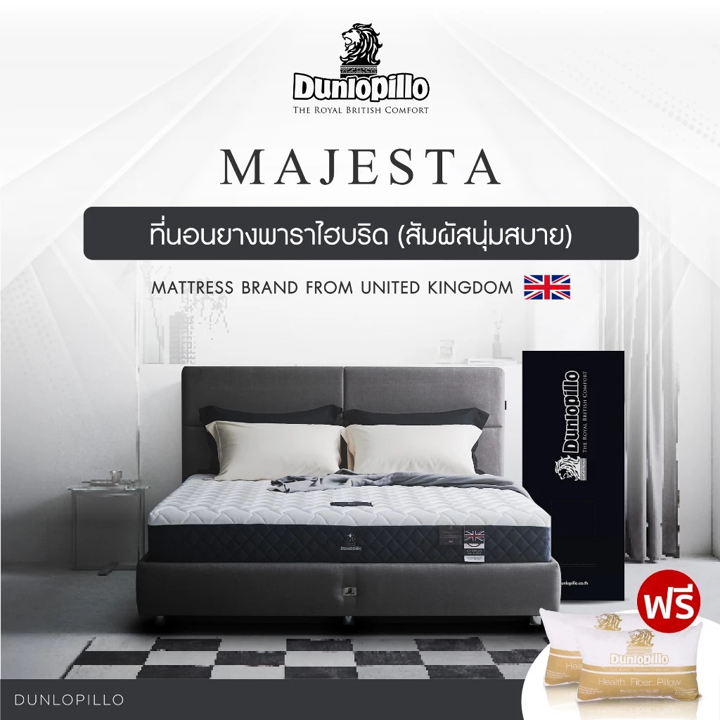 Dunlopillo รุ่น Majesta lll ที่นอนยางพาราแท้ไฮบริด หนา 9.5 นิ้ว รุ่นยอดนิยมของยุโรป ลดอาการปวดหลังได้อย่างตรงจุด สัมผัสแน่นสบาย ผ้าหุ้ม Dunlopillo Design Cotton – Velour Fabric นำเข้าจากประเทศอังกฤษ ระบบกระจายแรงกดทับ และช่วยผ่อนคลาย ใยสังเคราะห์คุณภาพสูงในทุกสัมผัสนุ่มนวลคลายแรงกดทับ Body Care นำเข้าจากประเทศอังกฤษ High Density ระบายอากาศได้ในตัวช่วยสร้างความรู้สึกผ่อนคลาย