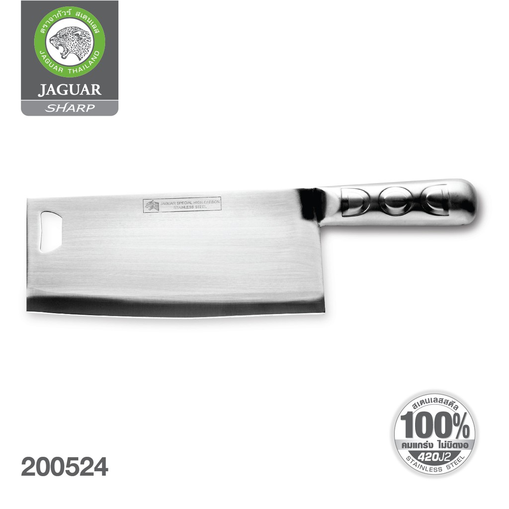 JAGUAR มีดสับ ตราจากัวร์ ขนาด 10 นิ้ว ผลิตจากสแตนเลสสตีล คุณภาพดีเยี่ยม มีความหนาพิเศษ ด้ามสแตนเลส จับถนัดมือ ใช้สำหรับ สับ เนื้อสัตว์ที่ติดกระดูก หรือตัดอาหารทั่วไป ปลายมีดออกแบบให้มีช่อง เพื่อใช้สำหรับการเปิดขวด หรือใช้แขวนเก็บได้ เพื่อความสะดวกในการจัดเก็บ