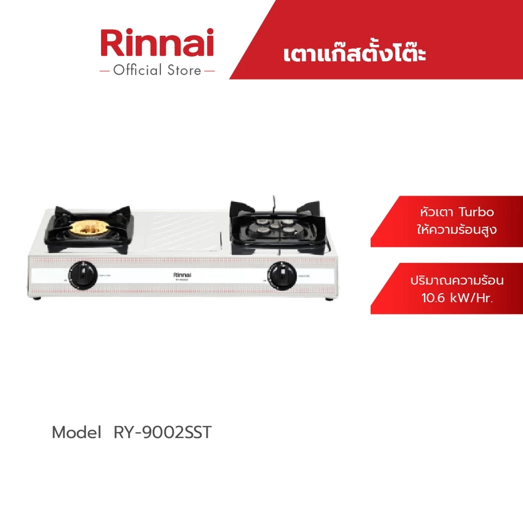 - Rinnai เตาแก๊ส ตั้งโต๊ะ แบบ 2 หัว หน้ากระจกนิรภัยทนความร้อนสูง รุ่น RT-902MM
