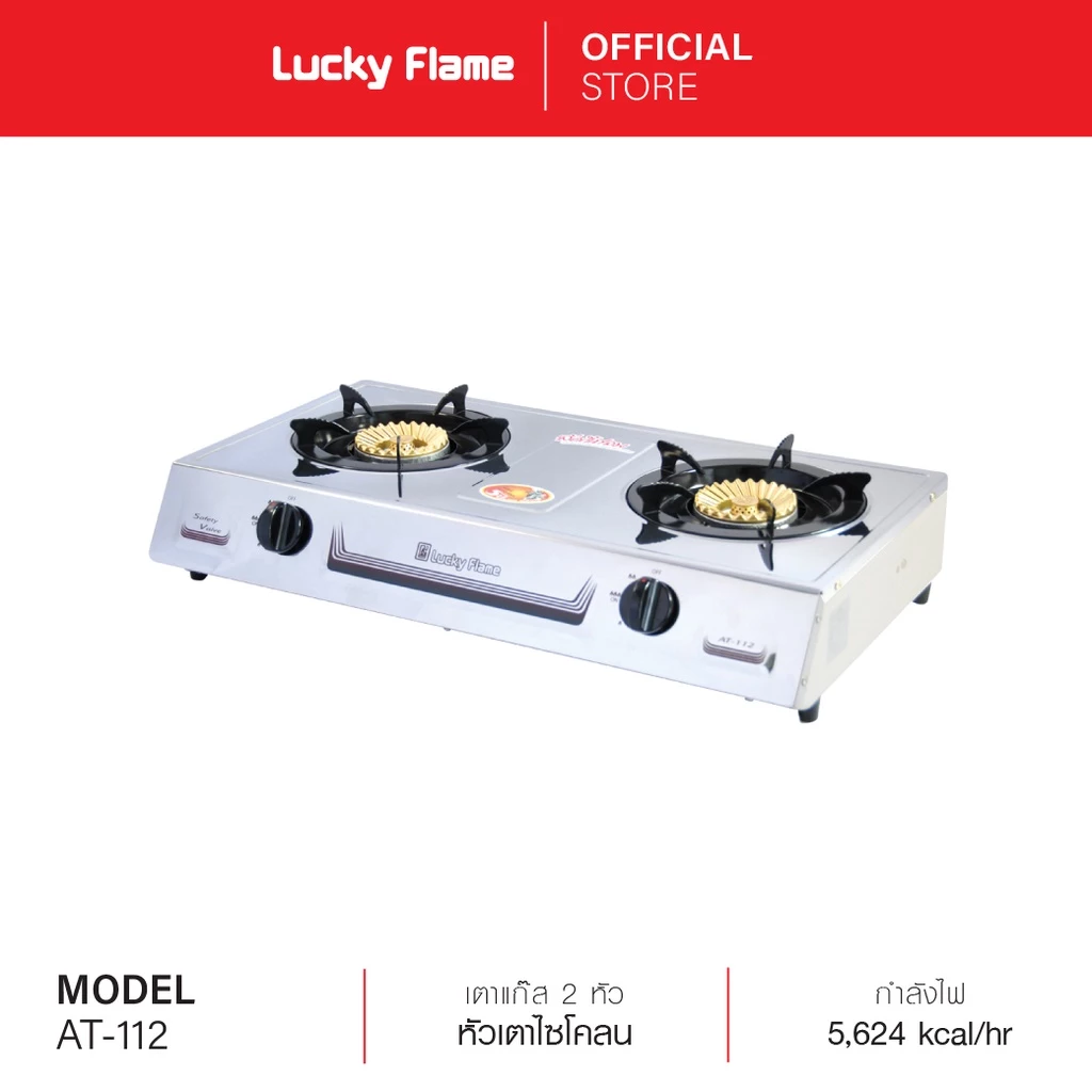 Lucky Flame เตาแก๊สตั้งโต๊ะ แบบ 2 หัวเตา รุ่น AT-142 หัวเตาและโครงสร้างเตาแก๊สผลิตจากสแตนเลสคุณภาพสูง ทนความร้อนโดยเฉพาะ ฝาเฟืองทองเหลืองแท้ ให้เปลวไฟสวยงาม เปลวไฟมีความสม่ำเสมอ ระบบจุดประกายไฟจุดติดได้ง่าย และให้ประกายไฟได้อย่างต่อเนื่อง พร้อมการรับประกันวาล์วแก๊ส เปิด-ปิด ยาวนานถึง 5 ปี