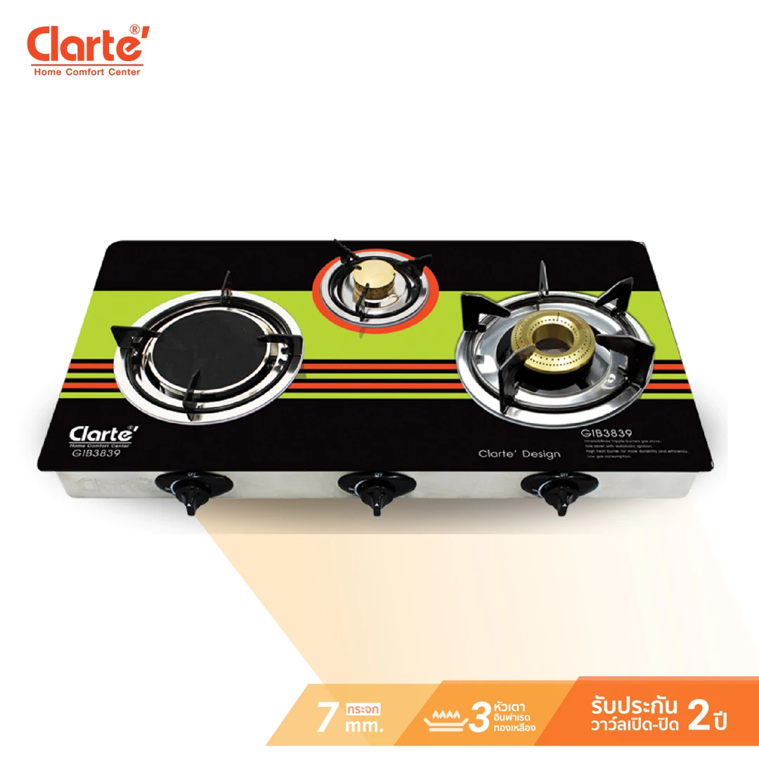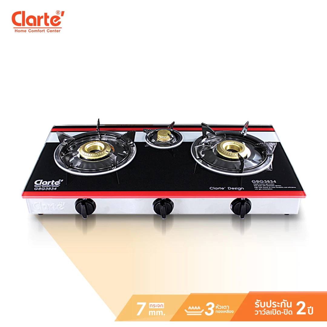 - Clarte’ เตาแก๊ส หัวทองเหลือง 3 หัวเตา แยกอิสระ ใช้งานพร้อมกันได้ รุ่น GBG3834