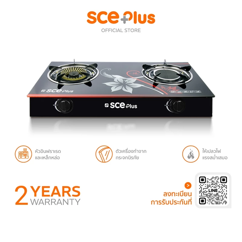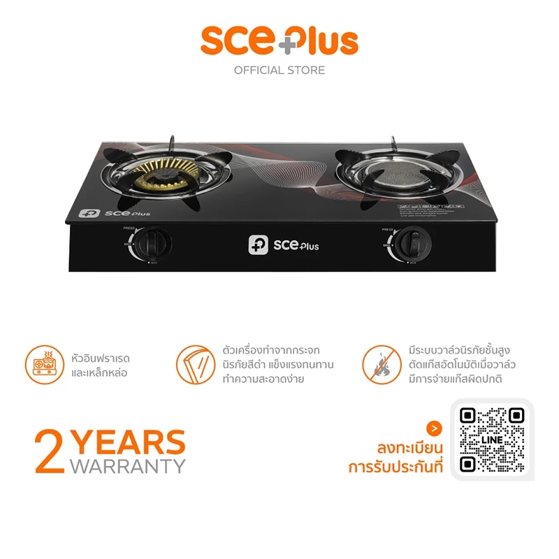 - SCE Plus เตาแก๊สหัวคู่หน้ากระจก หัวเตาแบบอินฟาเรด + หัวเตาเหล็กหล่อ รุ่น GG2