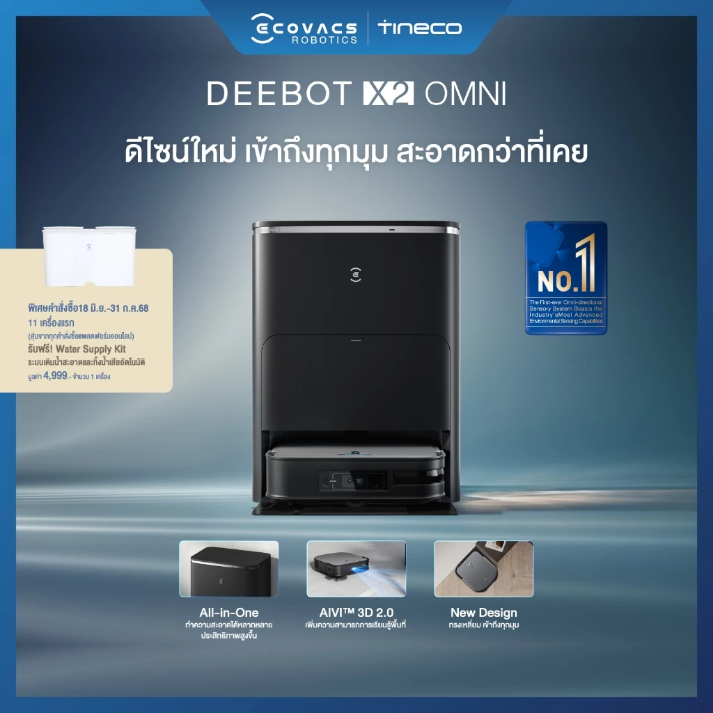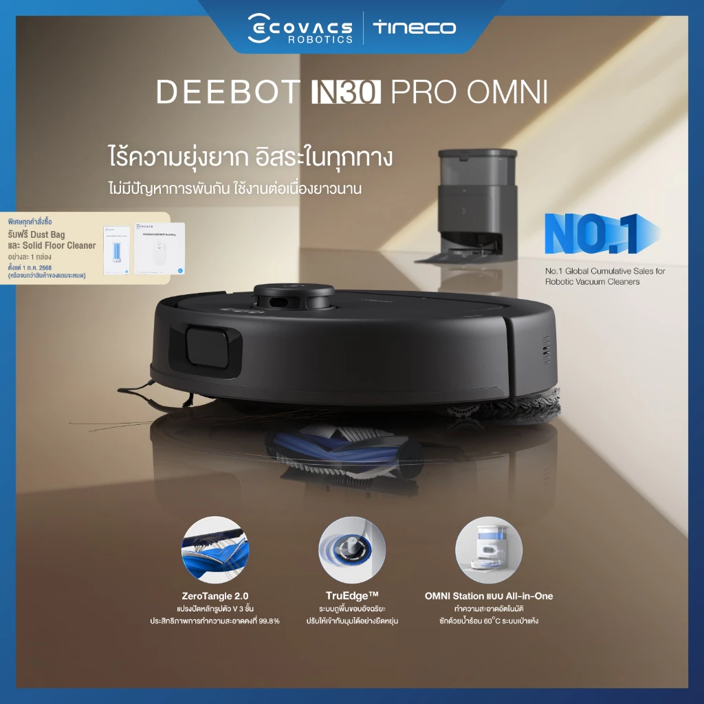 ECOVACS DEEBOT T50 PRO OMNI หุ่นยนต์ดูดฝุ่นผสานฟังก์ชั่นรอบด้าน เพื่อการทำความสะอาดที่ทรงพลัง ด้วยดีไซน์บางเฉียบ ทำให้ทำความสะอาดใต้เฟอร์นิเจอร์ได้อย่างง่ายดาย พร้อมระบบ dToF LiDAR และ TruEdge 2.0 ที่ซอกซอนทุกมุม ครอบคลุมพื้นที่ 100% แรงดูดทรงพลัง 15,000Pa ขจัดฝุ่นได้อย่างหมดจด