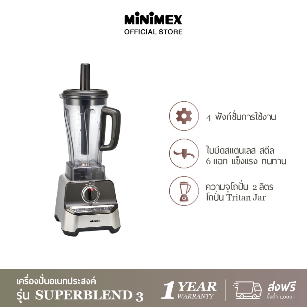 MiniMex เครื่องปั่นน้ำผลไม้ เครื่องปั่นสมูทตี้ เครื่องปั่นอเนกประสงค์ รุ่น Superblend 3 โถปั่น Tritan Jar ความจุสูงสุด 2 ลิตร มาพร้อมใบมีดสแตนเลสสตีล SUS304 แบบ 6 แฉก ที่มีความแข็งแรง ทนทาน ปุ่มควบคุมความเร็วแบบหมุน พร้อม 4 ฟังก์ชั่นการใช้งานที่สะดวกและรวดเร็ว ด้วยการปั่นละเอียดแบบอัตโนมัติ โดยใช้เวลาเพียง 35 วินาทีเท่านั้น