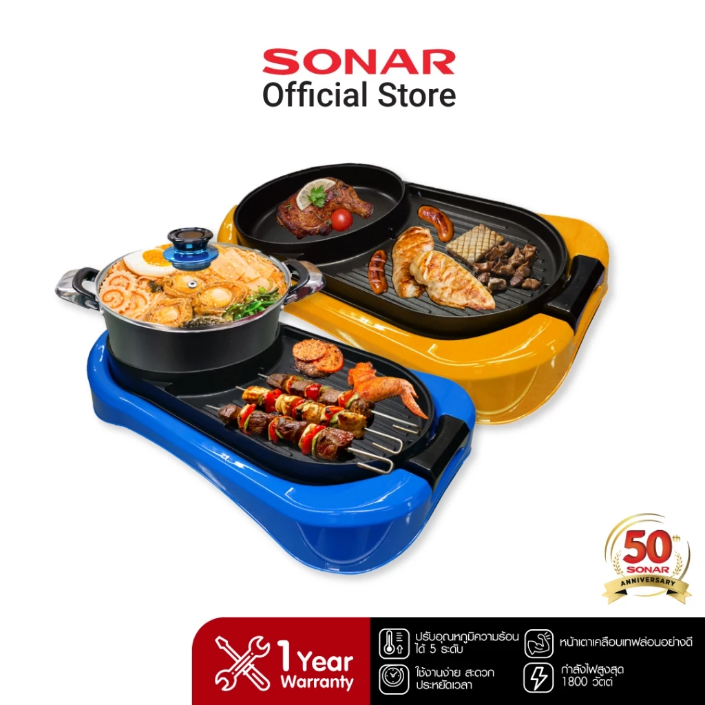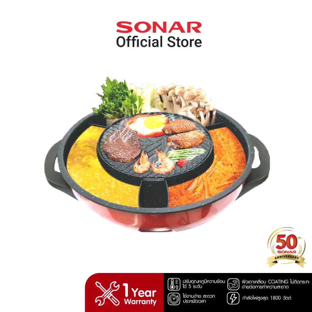 - Sonar เตาหมูกระทะ เตาปิ้งย่าง ใช้ไฟฟ้า พร้อมหม้อชาบู 1650W รุ่น SF-M51