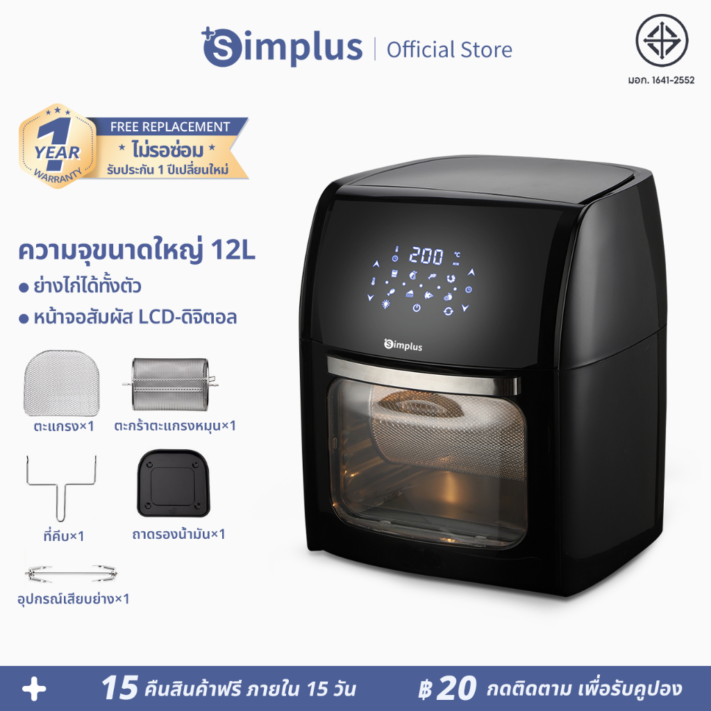 - อุปกรณ์เสริม: ตะแกรงย่าง / ถาดอบเคลือบสารกันติด / อุปกรณ์จับถาด / แกนเสียบสำหรับย่าง / อุปกรณ์จับแกนเสียบสำหรับย่าง / ตะกร้าทอดไร้น้ำมัน