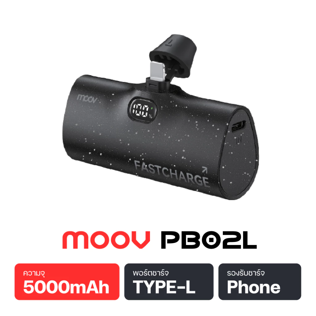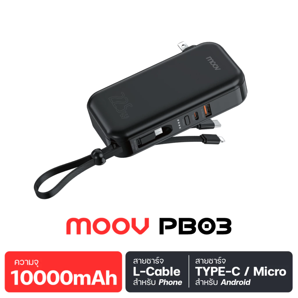 Moov รุ่น PB01 แบตสำรอง Fast Charge ความจุ 15000mAh แบบมีสายชาร์จในตัว Type C และ L Cable มีปลั๊กในตัว สามารถชาร์จไฟเข้าพาวเวอร์แบงค์ และจ่ายไฟไปยังอุปกรณ์ต่างๆ ได้ สะดวกสบายต่อการใช้งาน ดีไซน์ขนาดพอดีมือ พกพาสะดวก ไม่เล็กและไม่ใหญ่จนเกินไป มีให้เลือกถึง 4 สี ได้แก่ สีขาว สีดำ สีม่วง และสีชมพู