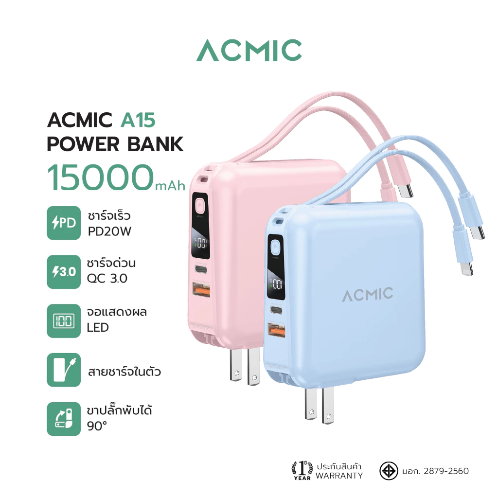 ACMIC รุ่น W1501 พาวเวอร์แบงค์ ความจุ 15000mAh มาพร้อมเทคโนโลยีชาร์จเร็ว Fast Charge PD20W และมีสายชาร์จในตัว มีหน้าจอแสดงปริมาณแบตเตอรี่แบบ LED Display และสวิตท์เปิด-ปิดการใช้งาน พร้อมกับช่องวางโทรศัพท์ และปลอดภัยยิ่งขึ้นด้วยระบบป้องกันกระแสไฟเกิน รวมถึงการป้องกันอุณหภูมิที่สูงผิดปกติ