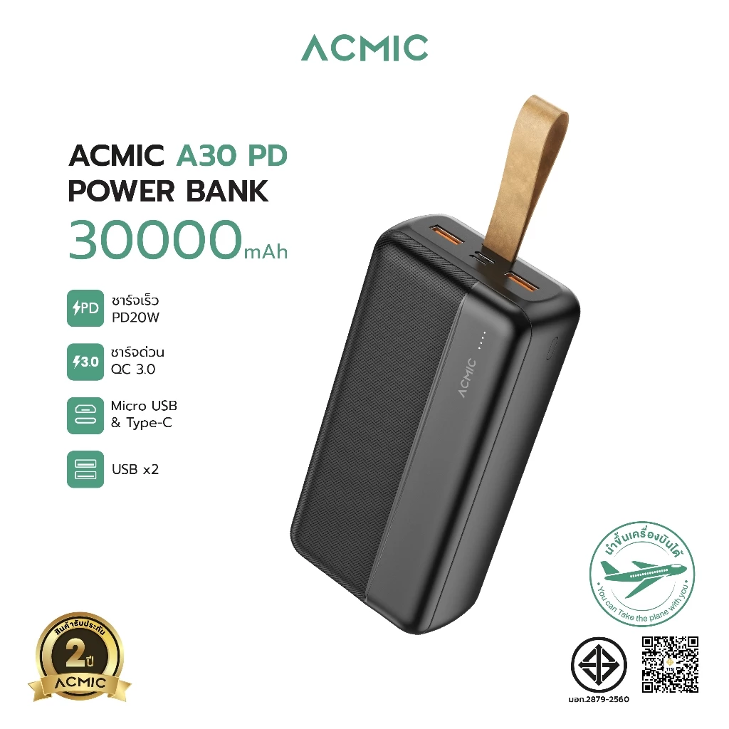 แบตสำรอง ความจุสูง 30,000mAh ที่มาพร้อมการรองรับการชาร์จเร็ว PD 20W และ SuperCharge 22.5W พร้อมด้วยพอร์ตใช้งานหลายช่อง โดยมีทั้ง USB-A และ USB-C สามารถชาร์จอุปกรณ์ได้หลายอุปกรณ์พร้อมกัน พาวเวอร์แบงค์ผลิตจากวัสดุที่ทนความร้อนได้สูง มีความแข็งแรง และได้รับการรับรองมาตรฐาน มอก.