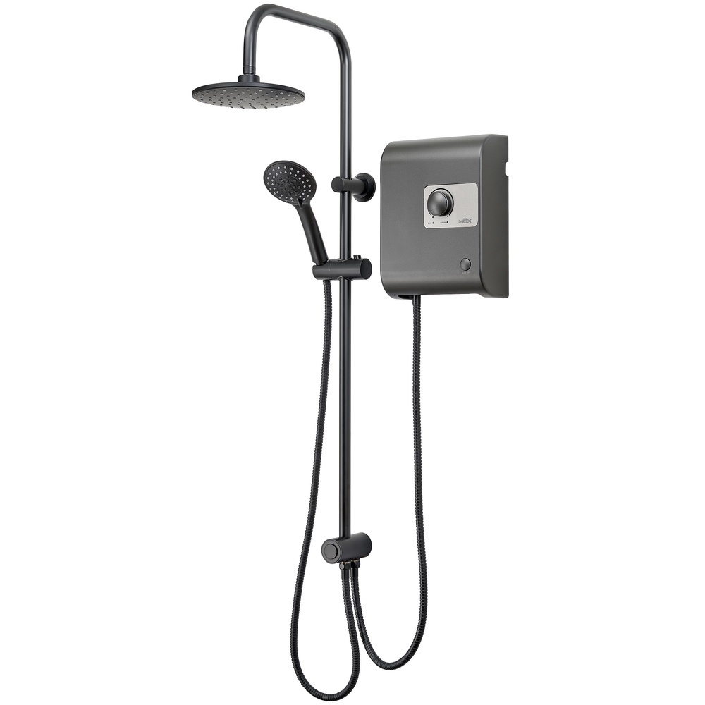 MEX เครื่องทำน้ำอุ่น สีดำเมทาลิค รุ่น CUBE 6E (RMB) กำลังไฟ 6,000 วัตต์ มาพร้อมชุดฝักบัว Rain Shower เครื่องรุ่นนี้มีการเพิ่มระบบตรวจสอบการต่อสายดินและสายไฟ โดยจะมีการแจ้งเตือนด้วยเสียงและสัญญาณไฟกระพริบเมื่อเกิดความผิดปกติ ตัวของหม้อต้มน้ำเป็นทองแดง คุณภาพดี ทนความร้อนสูง และมีระบบ ELCB ตัดไฟแบบอัตโนมัติ เมื่อเกิดกระแสไฟรั่ว เพื่อความปลอดภัยในการใช้งานมากที่สุด