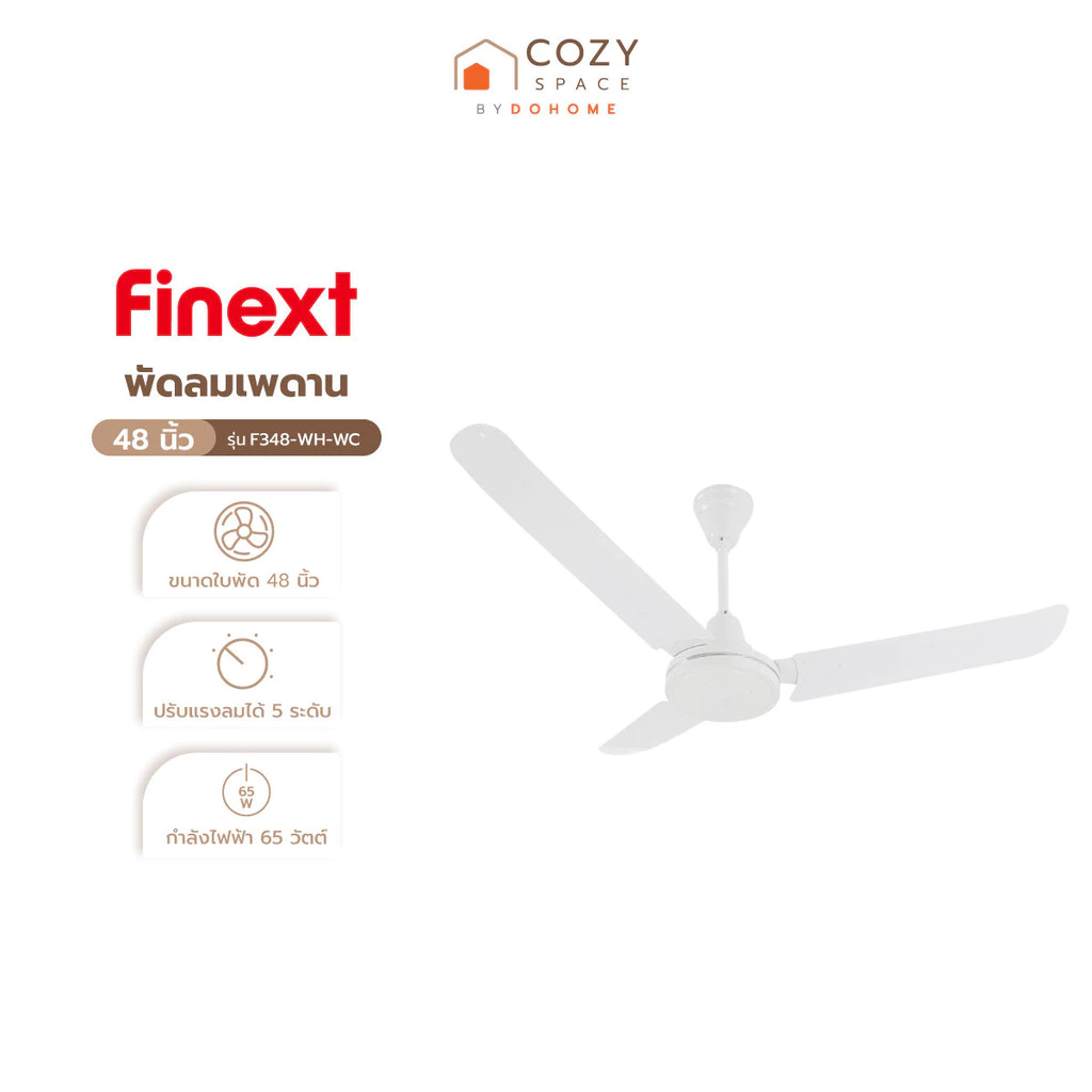 FINEXT พัดลมเพดาน 48″ รุ่น F348‑BK‑WC เป็นพัดลมเพดานขนาดกลาง‑ใหญ่ที่ให้ลมดีและกินไฟไม่มาก ปรับสปีดได้ 5 ระดับ เหมาะกับการใช้งานในห้องนั่งเล่น ห้องนอน หรือพื้นที่ทั่วไปในบ้าน
