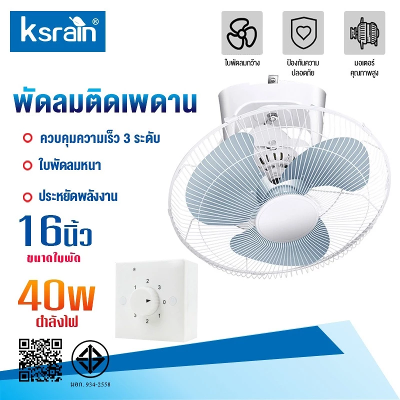 Ksrain พัดลมเพดาน /พัดลมโคจร 16″ เป็นตัวเลือกพัดลมเพดานขนาดเล็ก‑กลางที่ให้ฟังก์ชัน “โคจร /ส่าย” พร้อมตะแกรงเพื่อความปลอดภัย เหมาะกับห้องขนาดเล็กหรือมุมที่ต้องการลมหมุนรอบ