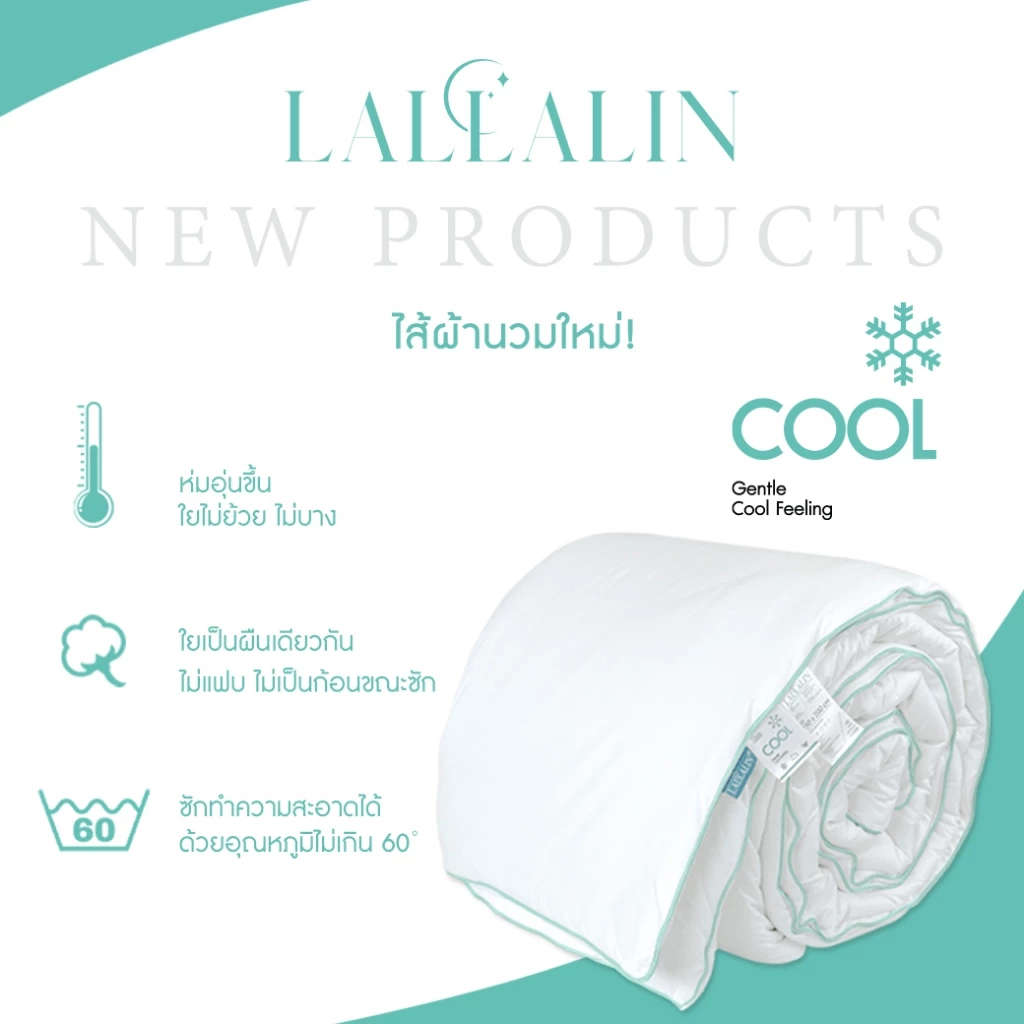 - “ห่มแล้วอุ่นไว – ห่มแล้วสบาย” และสามารถดูแลรักษาได้ง่าย โดยซักได้และใช้กับปลอกผ้านวมทั่วไปได้ ผลิตภัณฑ์เหมาะทั้งในห้องแอร์และห้องปกติ