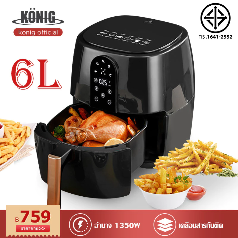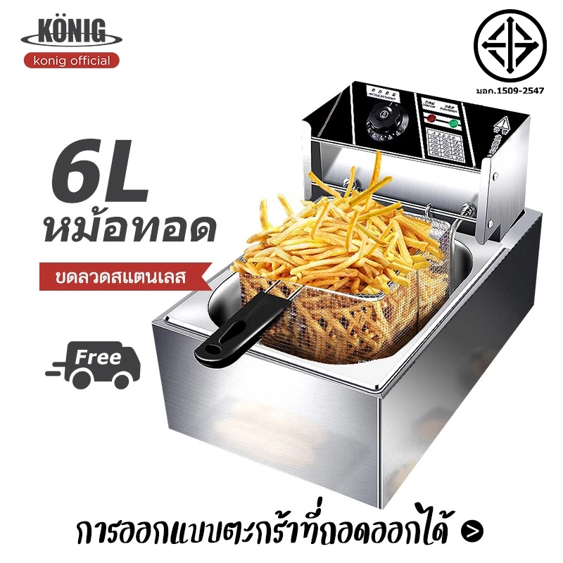 KONIG หม้อทอดไฟฟ้า 6 ลิตร เหมาะสำหรับผู้ประกอบการร้านอาหารหรือผู้ขายอาหารทอด จุดเด่นคือ ขนาดใหญ่ ทอดได้เร็ว ตัวเครื่องสแตนเลสทนทาน และตั้งอุณหภูมิได้แม่นยำ ใช้งานสะดวก ปลอดภัย เหมาะสำหรับทอดจำนวนมากในเวลาอันสั้น