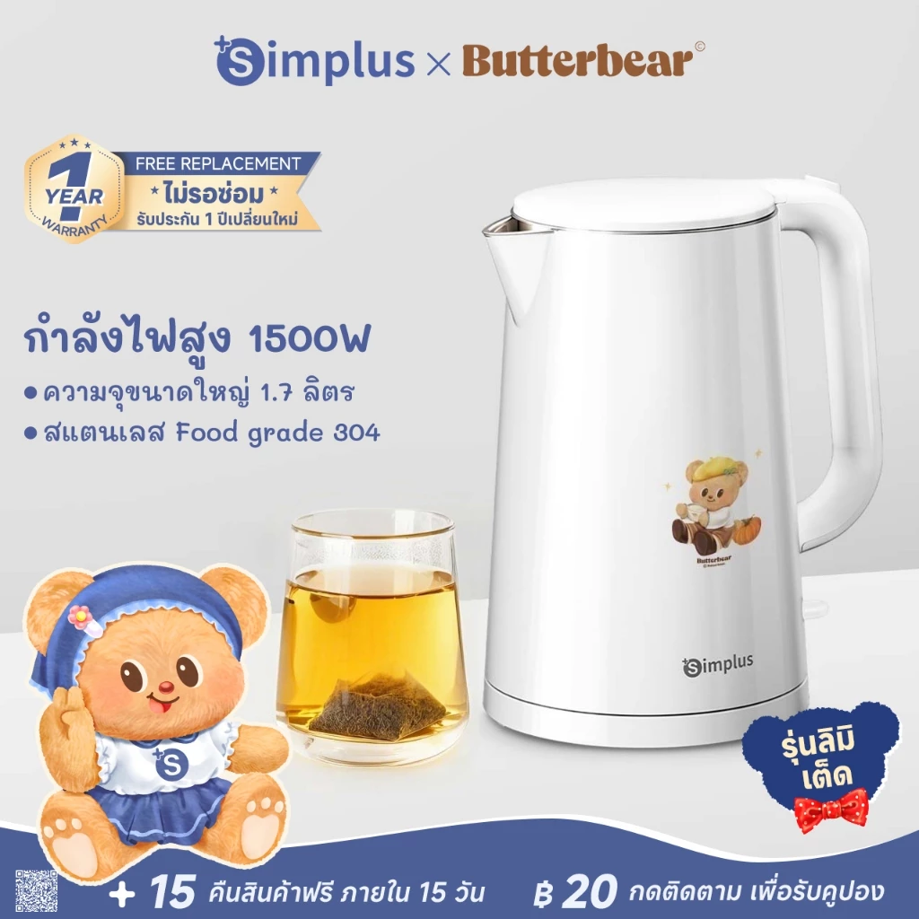Simplus DRSH006 เป็นกาต้มน้ำไฟฟ้าแบบ 2 ชั้นกันลวก ความจุ 1.7 ลิตร