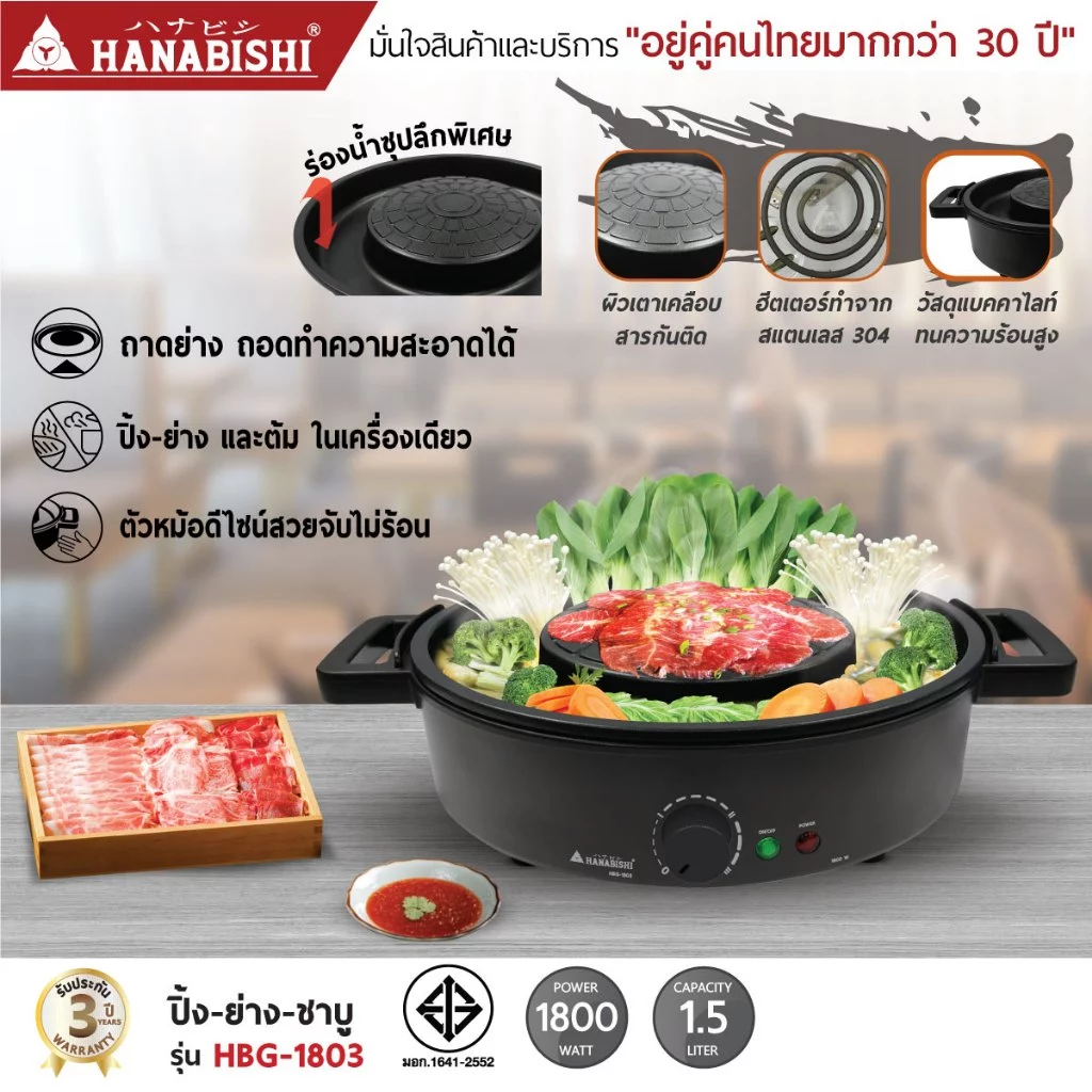 - ฟังก์ชันการใช้งาน: ใช้ได้หลายแบบ ทั้ง ชาบู ปิ้งย่าง นึ่ง และต้ม ในเครื่องเดียว
