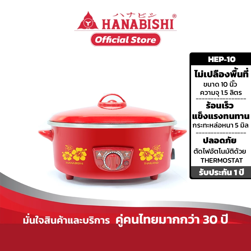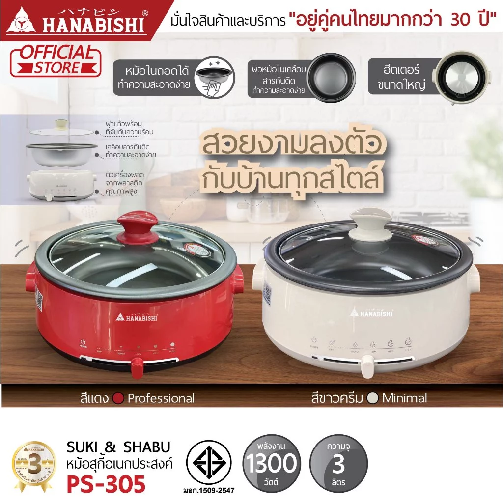 HANABISHI PS-305 เป็นหม้อสุกี้ไฟฟ้าอเนกประสงค์ เหมาะสำหรับปรุง สุกี้ ชาบู ปิ้งย่าง ในครัวเรือน ความจุเหมาะกับครอบครัวและการสังสรรค์หมู่เพื่อน หม้อเคลือบ Non-Stick ทำความสะอาดง่าย ปรับอุณหภูมิได้ตามต้องการ พร้อมระบบความปลอดภัยและรับประกันสินค้า 3 ปี ทำให้ใช้งานได้อย่างมั่นใจ