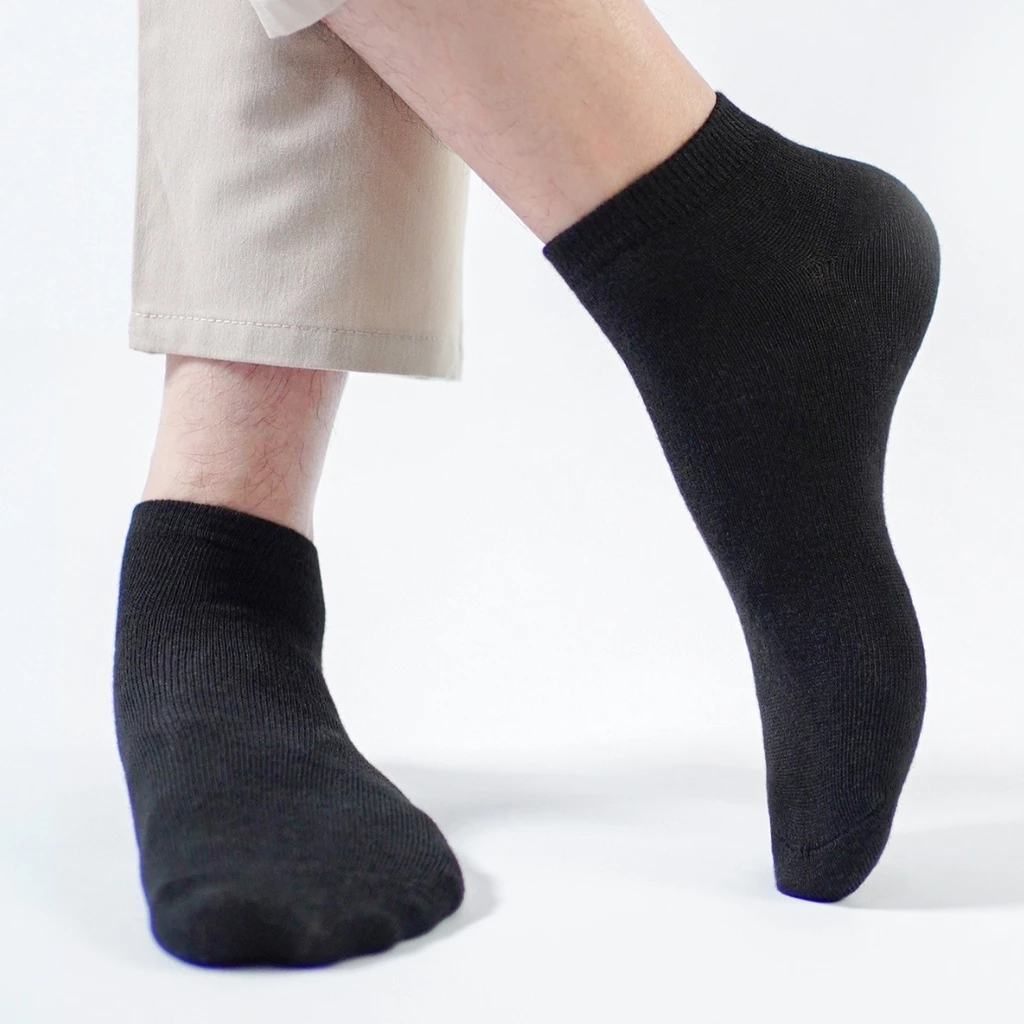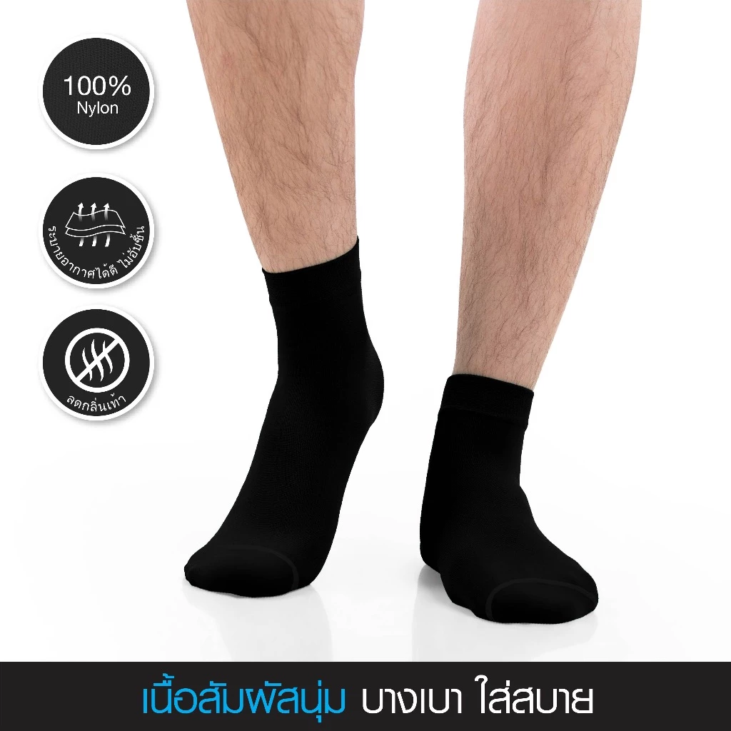 - ทรง: Low cut หรือข้อสั้นขอบอยู่พอดีข้อเท้า เหมาะกับการสวมใส่รองเท้าทั่วไป โดยสีดำล้วนดูเรียบง่าย