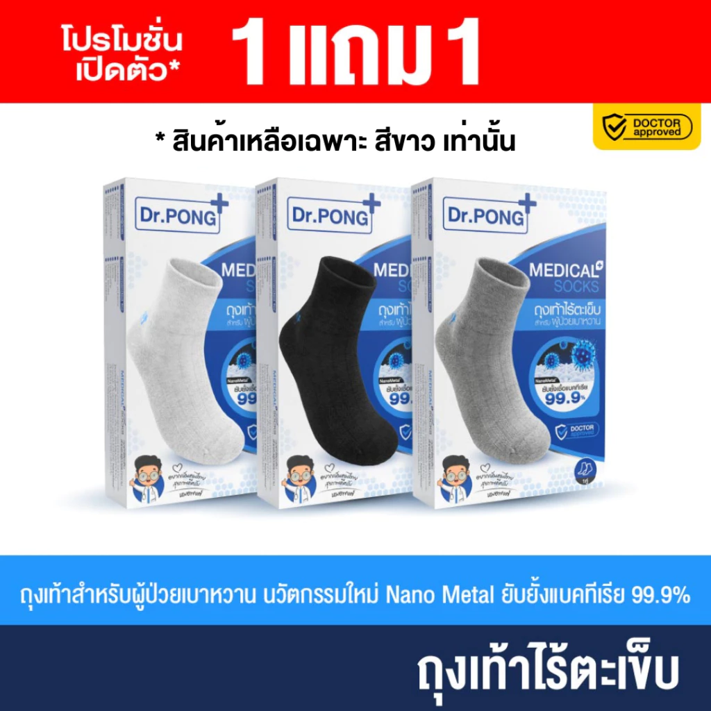 Dr. PONG Medical Socks เป็นถุงเท้าสุขภาพที่เหมาะสำหรับผู้ป่วยเบาหวานและผู้สูงอายุ ด้วยการออกแบบที่เน้นความปลอดภัยและความสบายในการสวมใส่ โดยเฉพาะการใช้เส้นใย NanoMetal ที่ช่วยยับยั้งแบคทีเรียและเชื้อรา รวมถึงการออกแบบไร้ตะเข็บและไม่รัดบริเวณข้อเท้า ช่วยลดความเสี่ยงจากการเกิดแผลและการบวมที่เท้า เหมาะสำหรับผู้ที่ต้องการดูแลสุขภาพเท้าอย่างมีประสิทธิภาพ