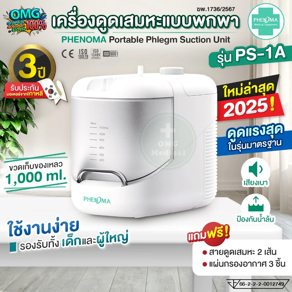 PHENOMA PS-1A เป็นเครื่องดูดเสมหะแบบพกพาที่ออกแบบมาสำหรับใช้งานในบ้าน /คลินิก เหมาะสำหรับผู้ป่วยที่มีเสมหะหรือน้ำมูก เครื่องให้แรงดูดดี มีระบบป้องกันล้น และเสียงเงียบ ใช้งานสะดวกและมอเตอร์ทนทาน (รับประกัน 3 ปี)