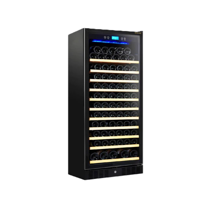 ตู้แช่ไวน์ SINGER WINE COOLER 12.36 คิว เหมาะสำหรับผู้ที่ต้องการ เก็บไวน์จำนวนมากถึง ~116–127 ขวด พร้อมชั้นไม้จัดระเบียบขวด ระบบควบคุมอุณหภูมิเย็นสม่ำเสมอ และไฟ LED ภายใน ทำให้ไวน์ของคุณ เก็บรักษาได้อย่างมีประสิทธิภาพและดูเรียบร้อ