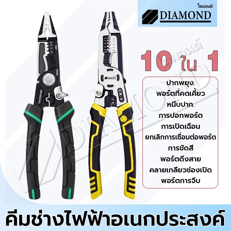 - ปากคีมมี ขอบตัดยาวและหลากหลายฟังก์ชัน ทั้งจับ ย้ำ ดัด และตัด