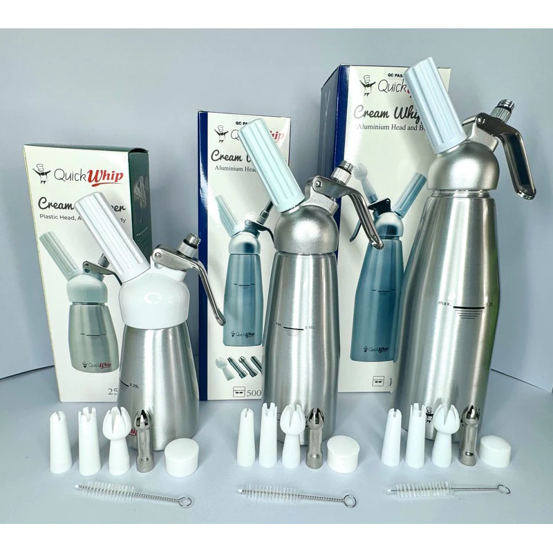 Quick Whip Cream Whipper เป็นกระบอกวิปครีมคุณภาพดี ใช้งานง่าย มีให้เลือกหลายขนาดตามความต้องการ ตั้งแต่ใช้ส่วนตัวที่บ้าน (250ml) ไปจนถึงร้านที่ต้องทำเครื่องดื่ม/ขนมจำนวนมาก (1000ml) จุดเด่นคือมาพร้อมหัวฉีดหลายแบบ ช่วยตกแต่งได้สวยงาม ใช้งานทนทาน เหมาะทั้งมือใหม่และมืออาชีพ แต่ถ้าเน้นความทนสุด ๆ อาจพิจารณารุ่นสแตนเลส